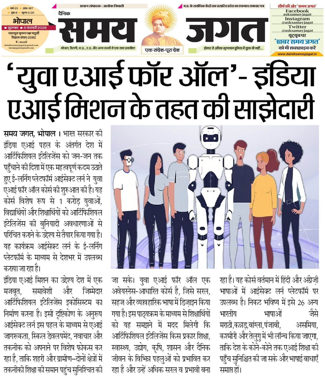 भोपाल। भारत सरकार की इंडिया एआई (IndiaAI) पहल के अंतर्गत देश में आर्टिफिशियल इंटेलिजेंस को जन–जन तक पहुँचाने की दिशा में एक महत्वपूर्ण कदम उठाते हुए ई-लर्निंग प्लेटफॉर्म आईसेक्ट लर्न ने “युवा एआई फॉर ऑल” कोर्स की शुरुआत की है। यह कोर्स विशेष रूप से 1 करोड़ युवाओं, विद्यार्थियों और शिक्षार्थियों को आर्टिफिशियल इंटेलिजेंस की बुनियादी अवधारणाओं से परिचित कराने के उद्देश्य से तैयार किया गया है। यह कार्यक्रम आईसेक्ट लर्न के ई-लर्निंग प्लेटफॉर्म के माध्यम से देशभर में उपलब्ध कराया जा रहा है।