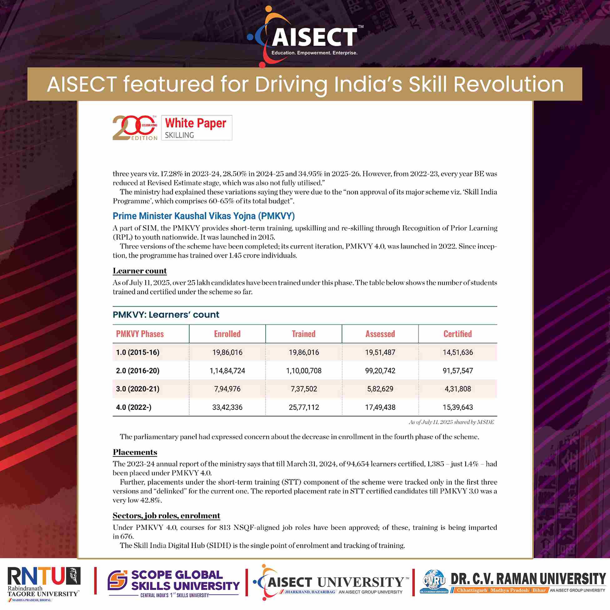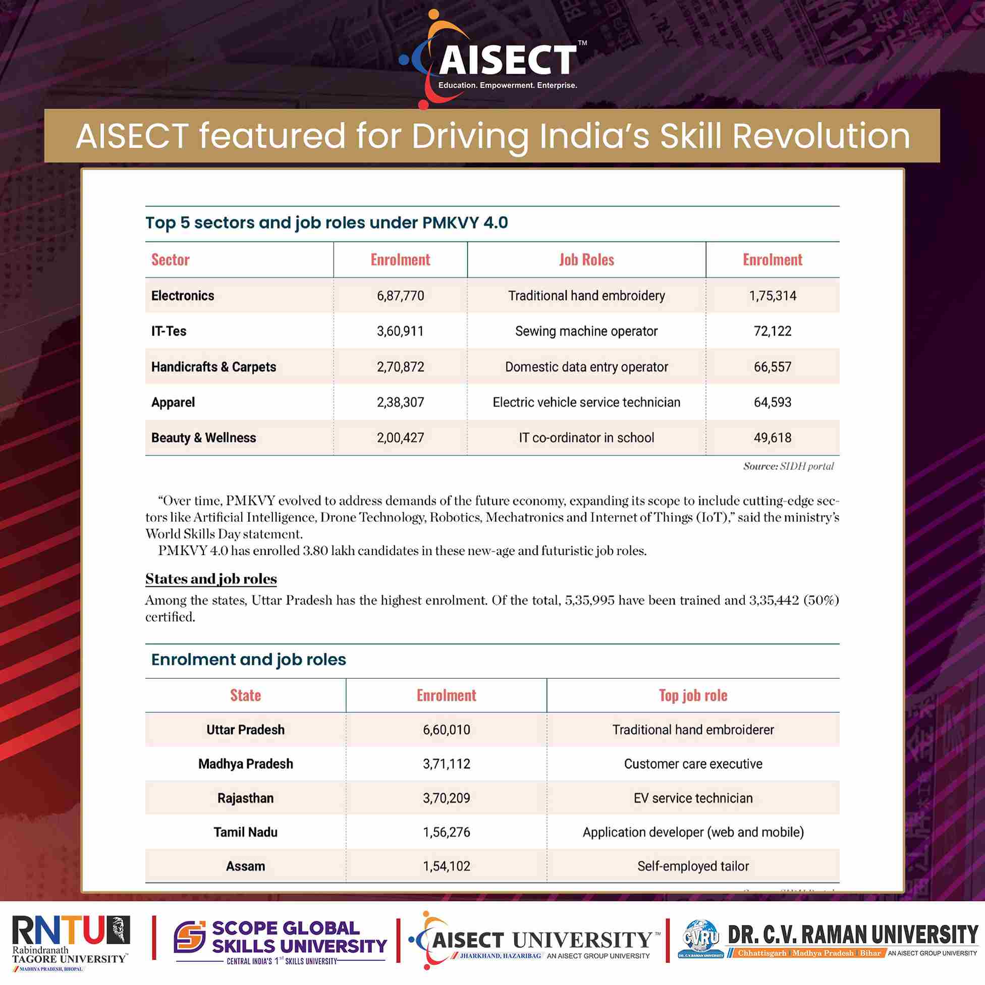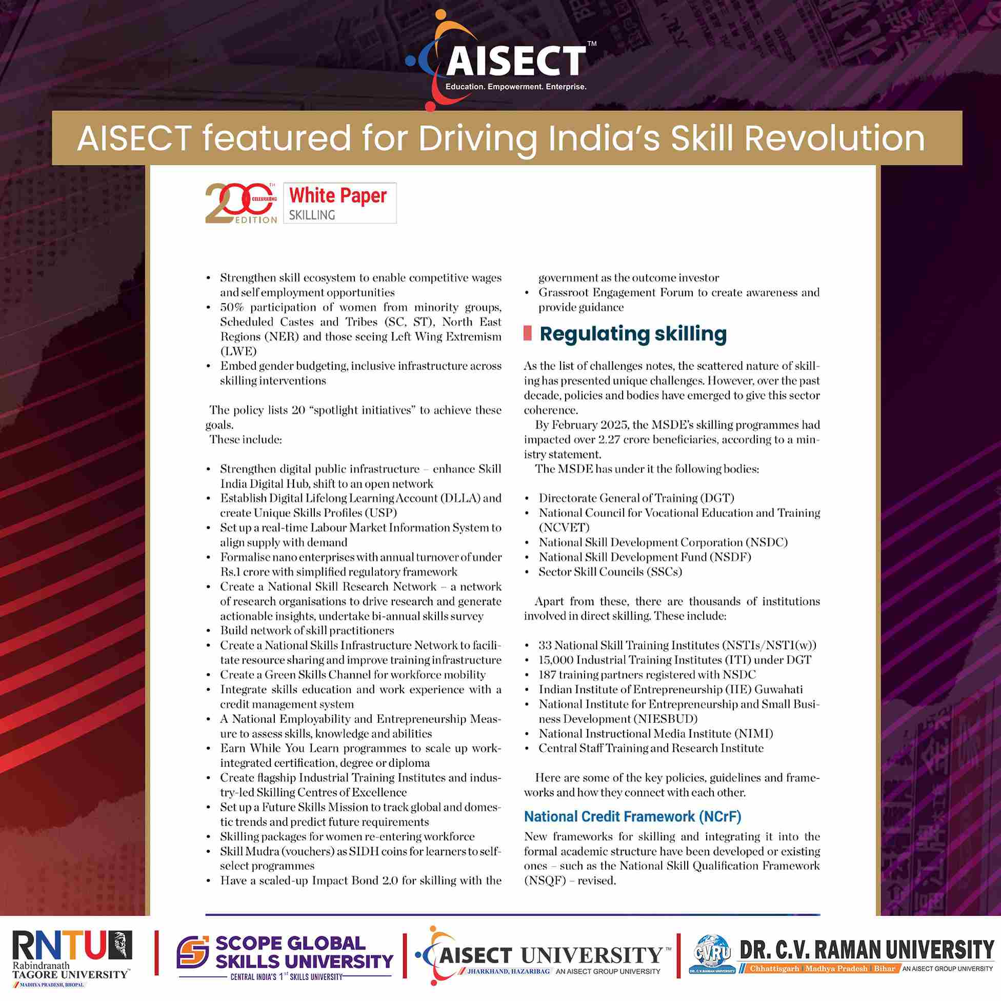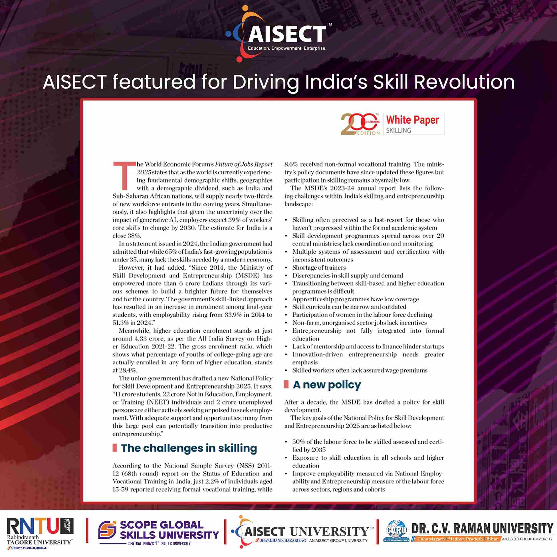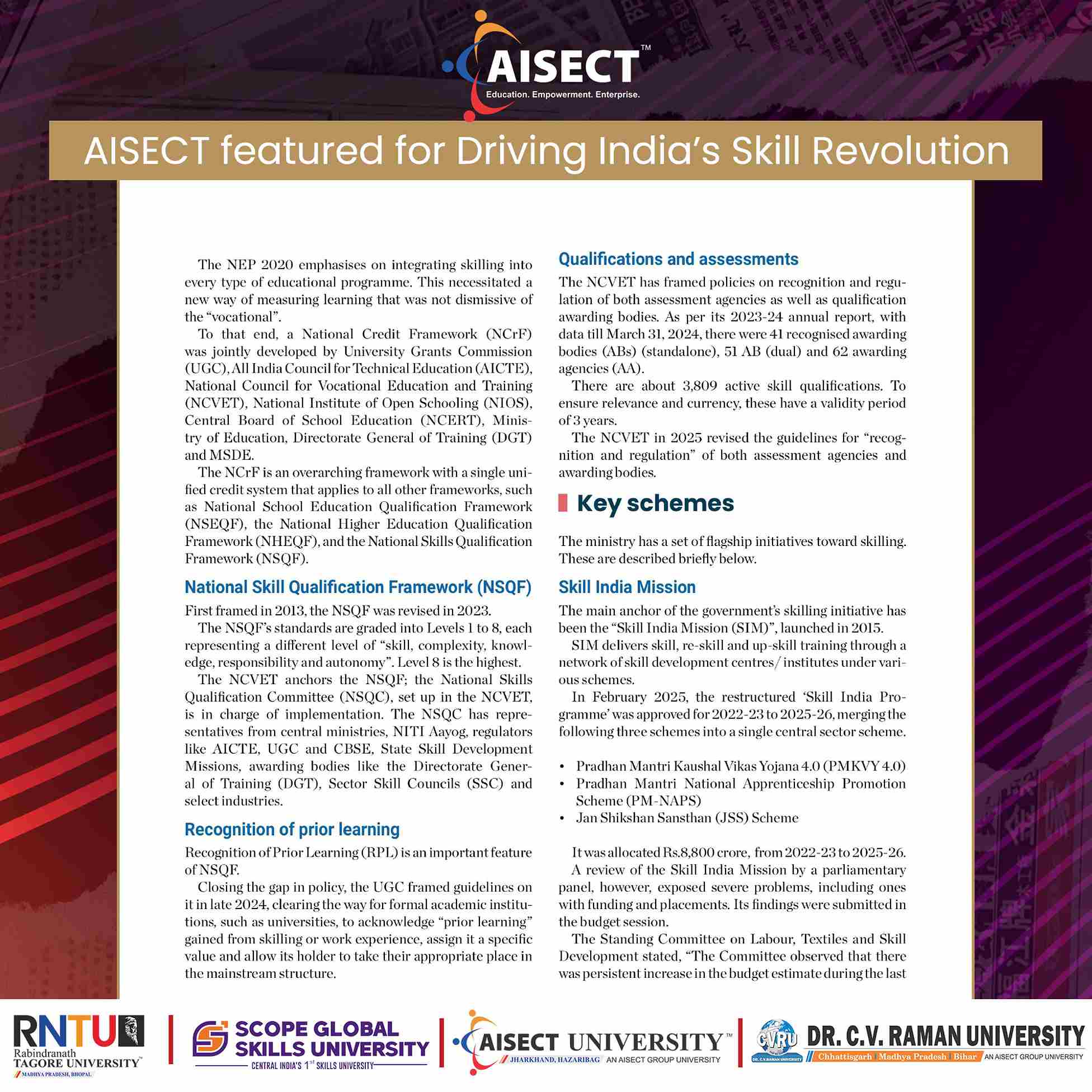 The feature recognises AISECT Group and its universities for their pioneering role in redefining higher education through skill-based, industry-integrated, and employment-oriented learning models aligned with national priorities such as NEP 2020, Skill India Mission, and Atmanirbhar Bharat.